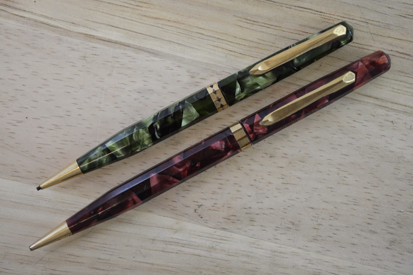 These were made by Eversharp, as you can tell by their close similarity in appearance to Eversharp’s Doric line of pens and pencils. Close, that is, but not exact: the bands are a little thinner than what you'll find on a Doric, and the cutouts aren't the same, either. If you really know your Dorics, you wouldn’t need to turn over the pencil to see what’s imprinted where you’d expect to see the word "Eversharp" on the back side: