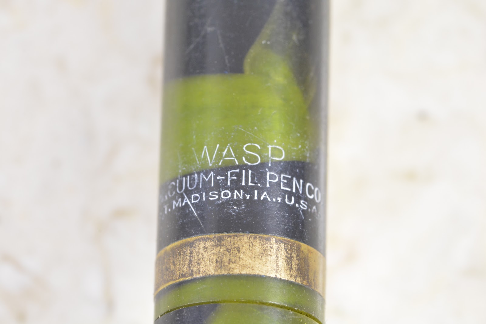 It had made the rounds in the online auctions a few times, never getting the opening bid of $20. I’d let it slide a few times, since that great limeade bumblebee color is really scarce, and I already had one in the Equipoised-mechanism model . . . I picked it up for just a couple bucks in a flea market junk box. What I didn’t have was one with the earlier mechanism like the red example at top in this next picture:
