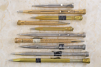 Next are some Eversharp metal pencils, including two post-1924 model in “ripple” with the matching engraving on the works inside: